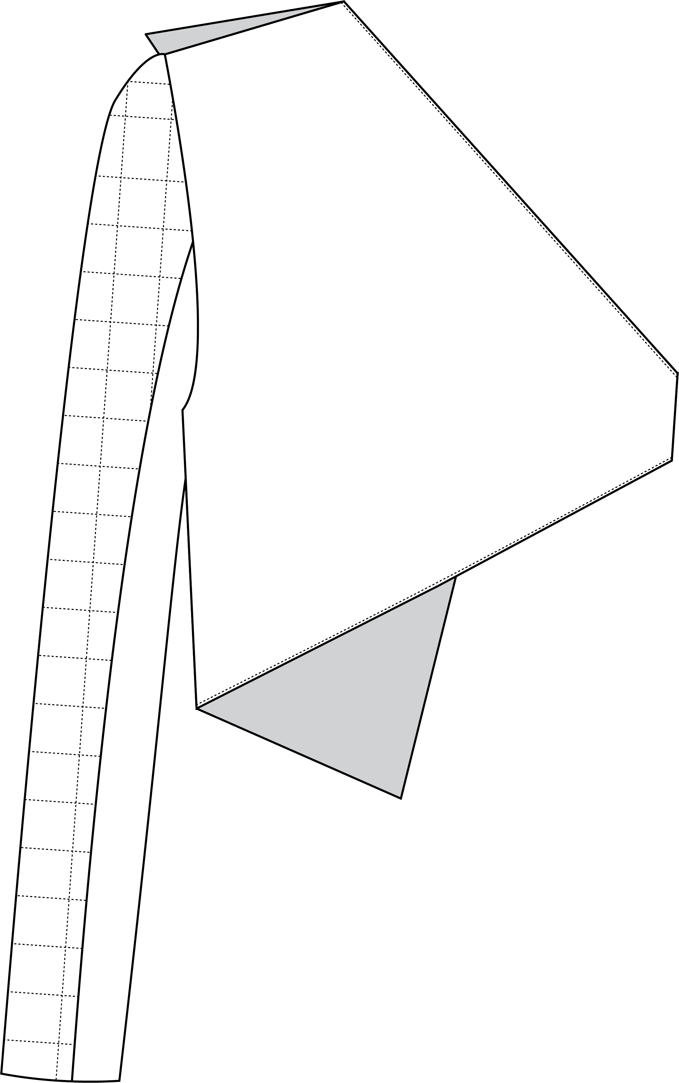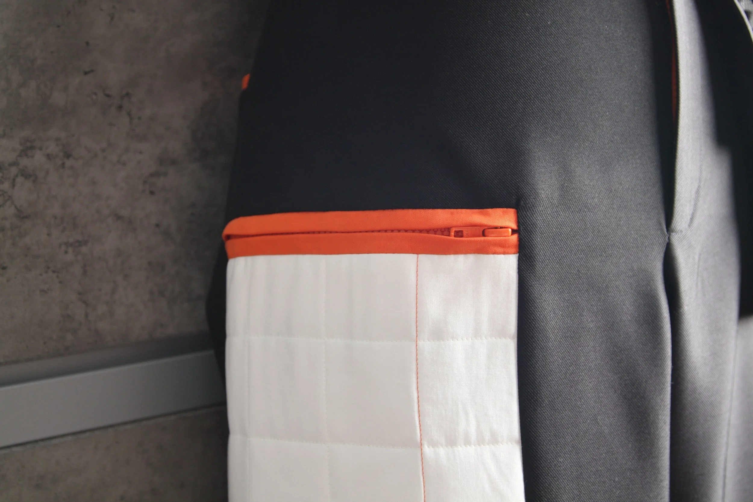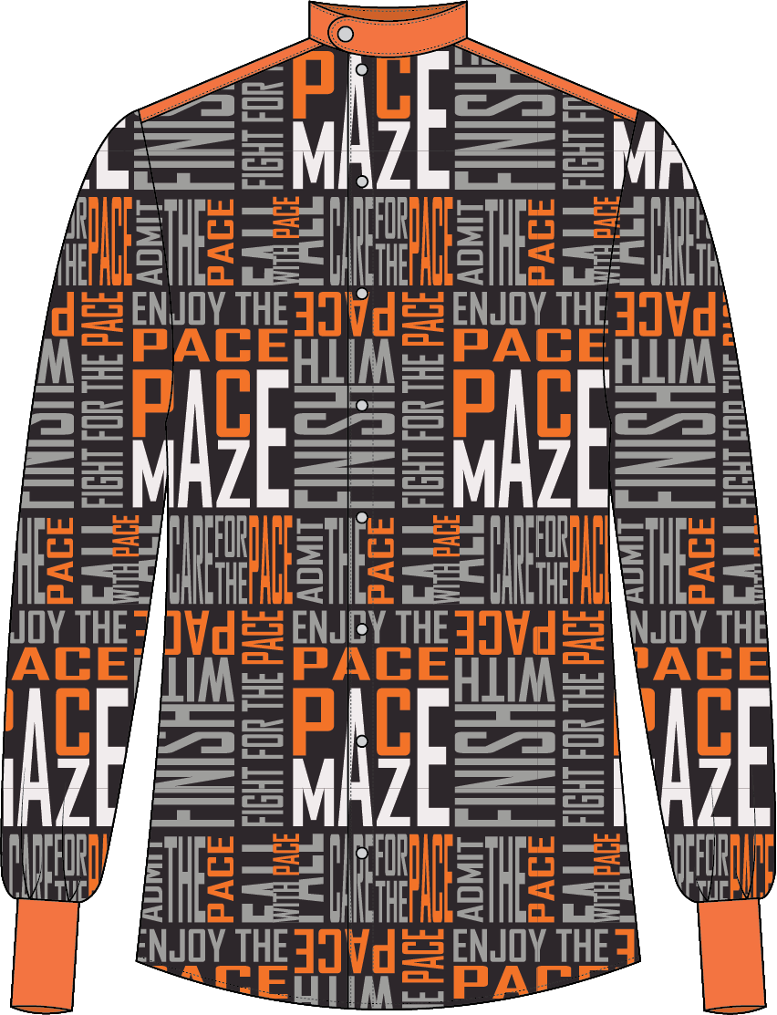 The blazer, which is only half of a blazer secured with a belt piece, reveals the vest and shirt underneath, offering a glimpse inside, which represents both acknowledgment and the admission of weaknesses. The dress shirt features a bold, cluttered all-over print, hinting at an underlying confusion. Interestingly, the button placket is shifted slightly to the side, creating a subtle asymmetry, though the print at the edge aligns perfectly. This shirt, representing the tangled subconscious, is protected by a vest that resembles a chest guard more than a traditional suit vest.