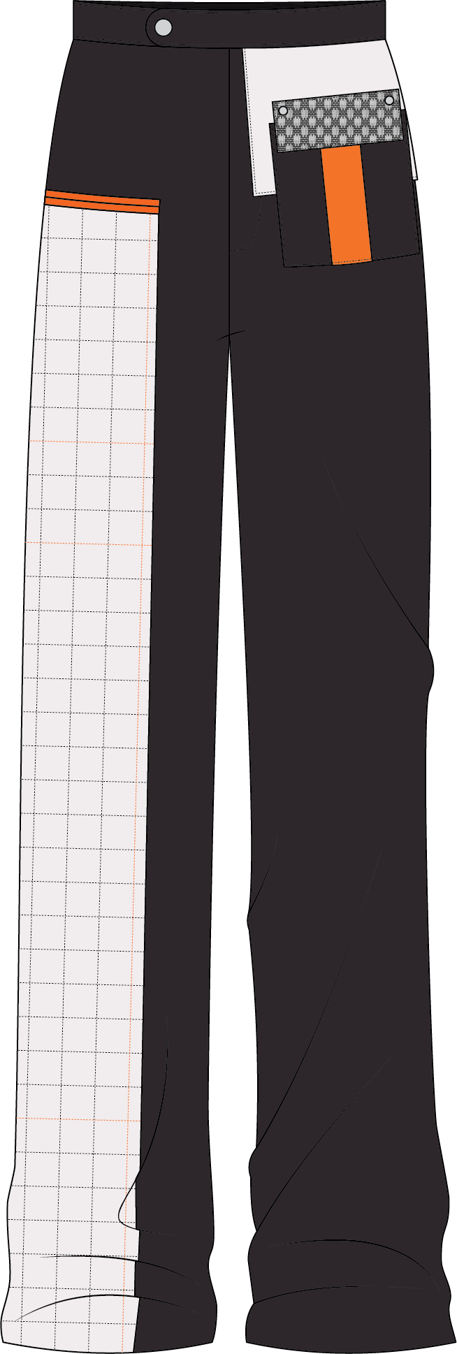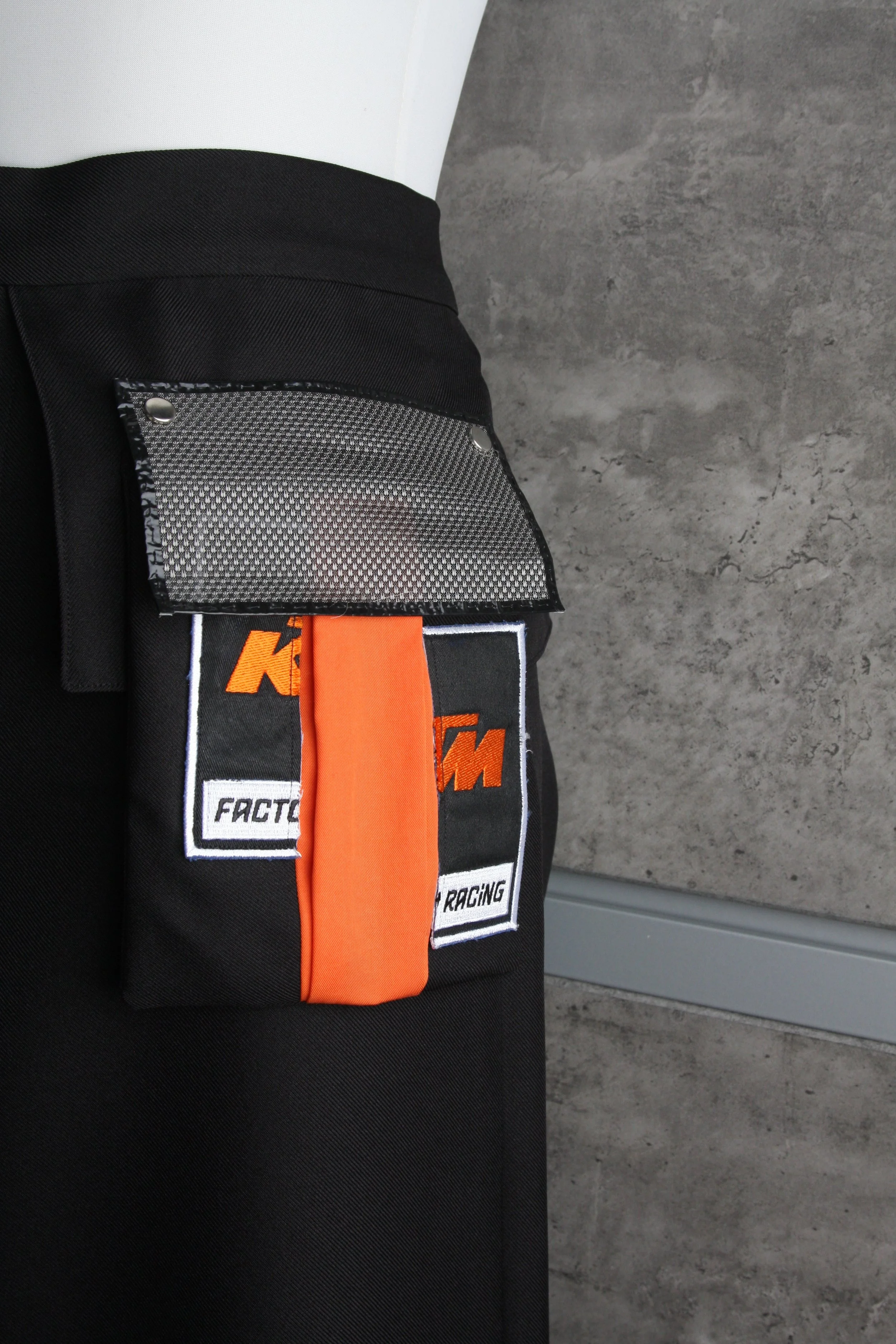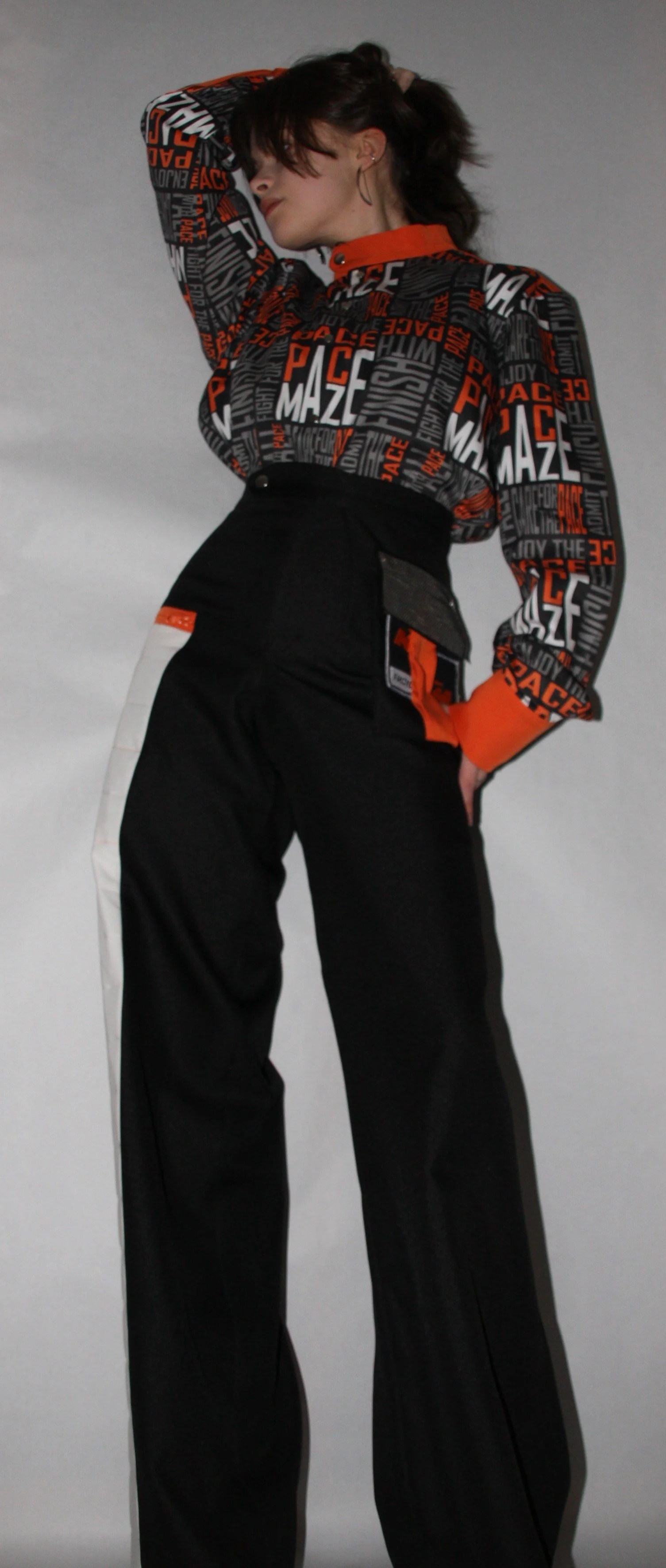 The base of the pants is a simple dress pant cut that is modified to look a bit more sporty. Instead of dynamic pleats, it has a striking, more static looking insert with a zipped welt pocket on the right leg. On the other side, you’ll find an unconventional patch pocket, that is attached to a piece of fabric inerted into the waistband. it’s wide, floor lenghth pant legs give this look a stong stability.