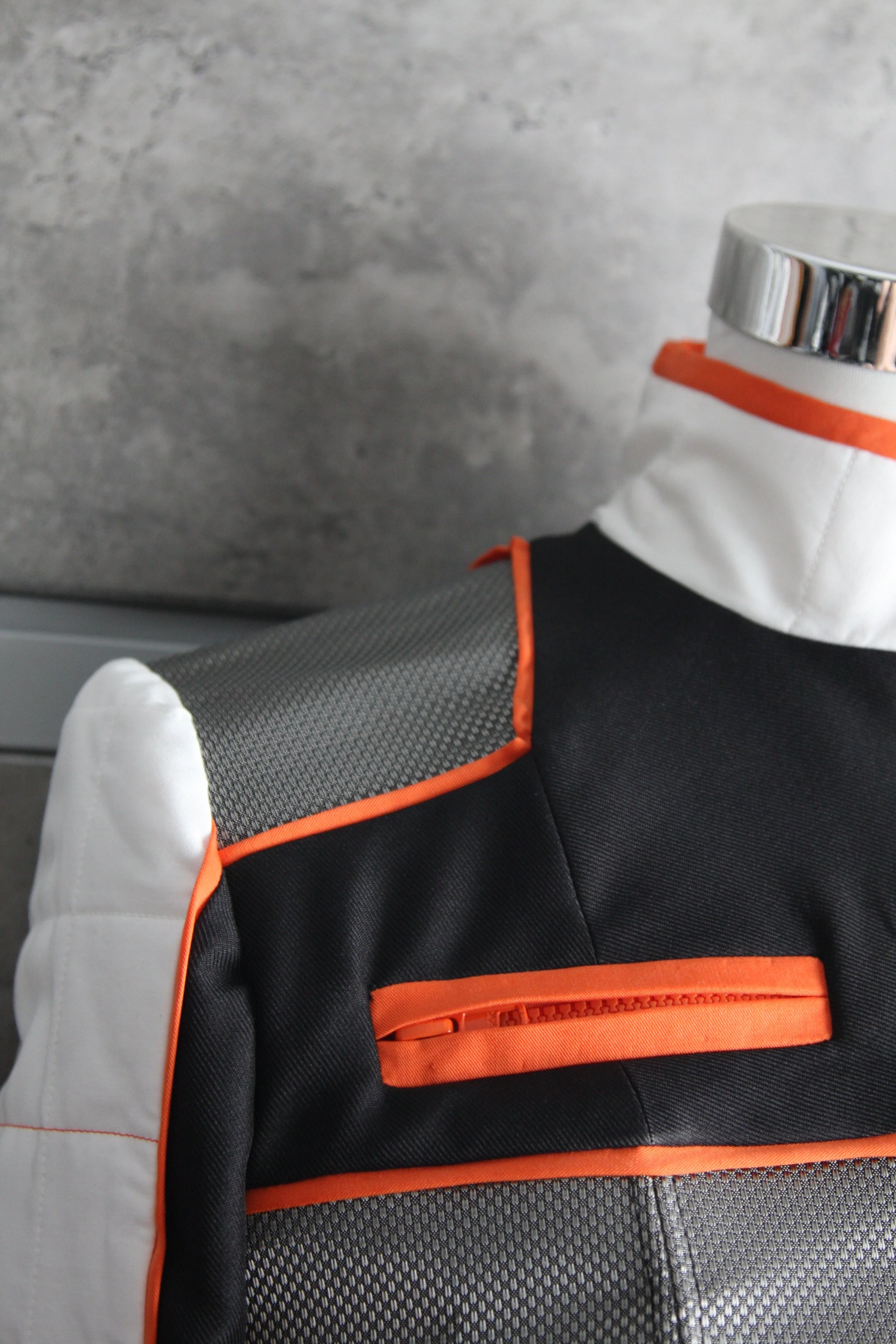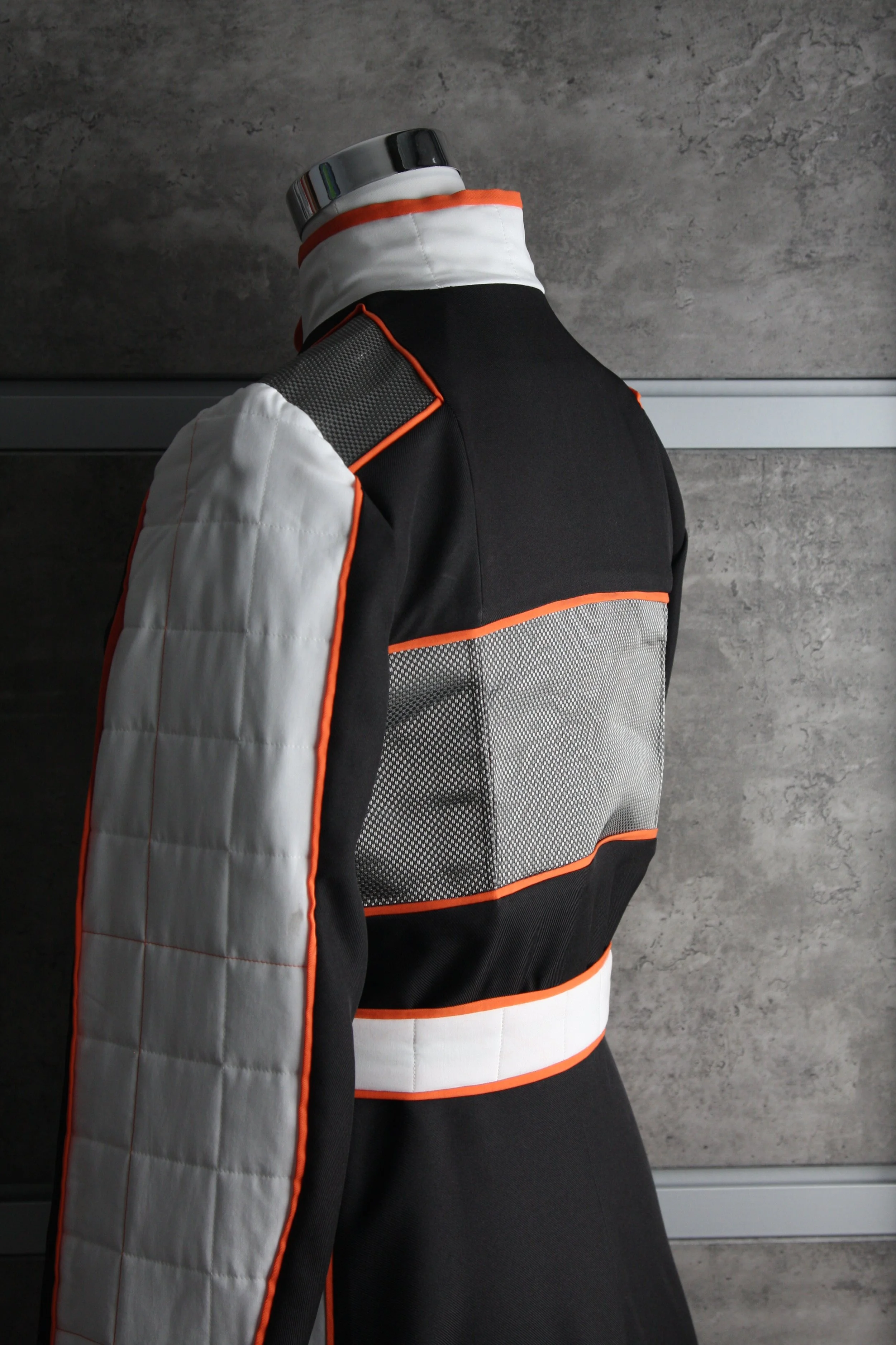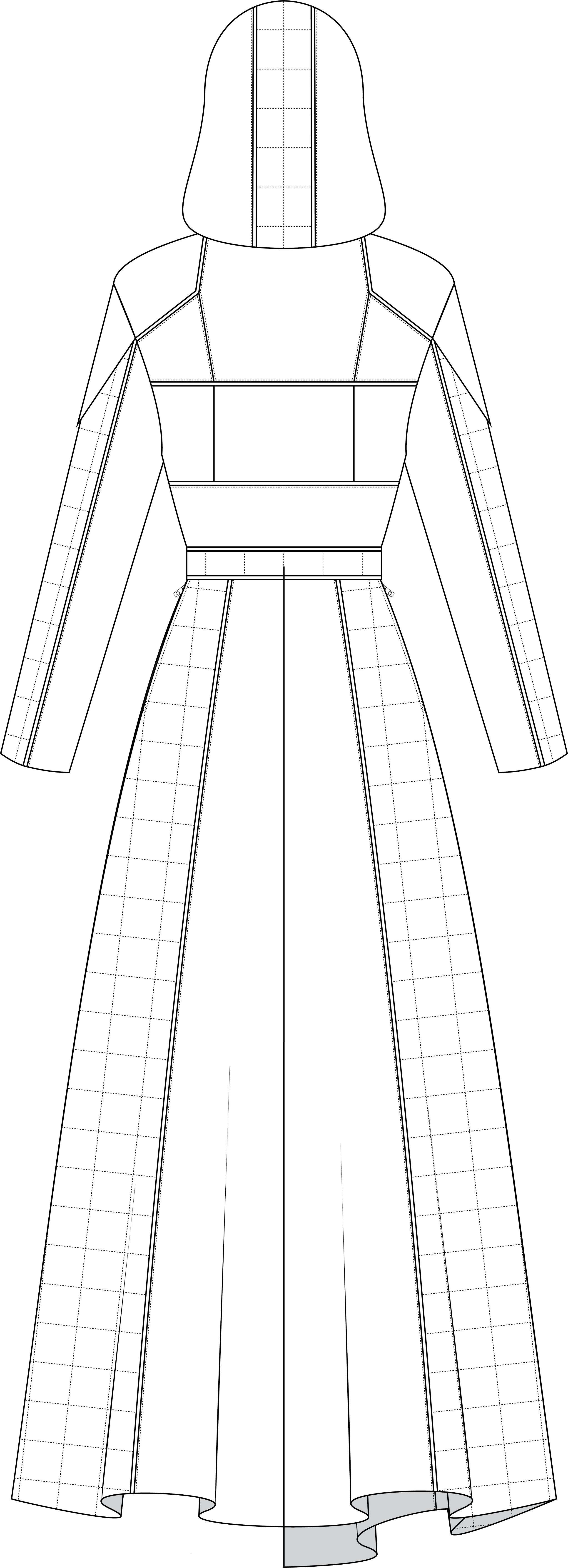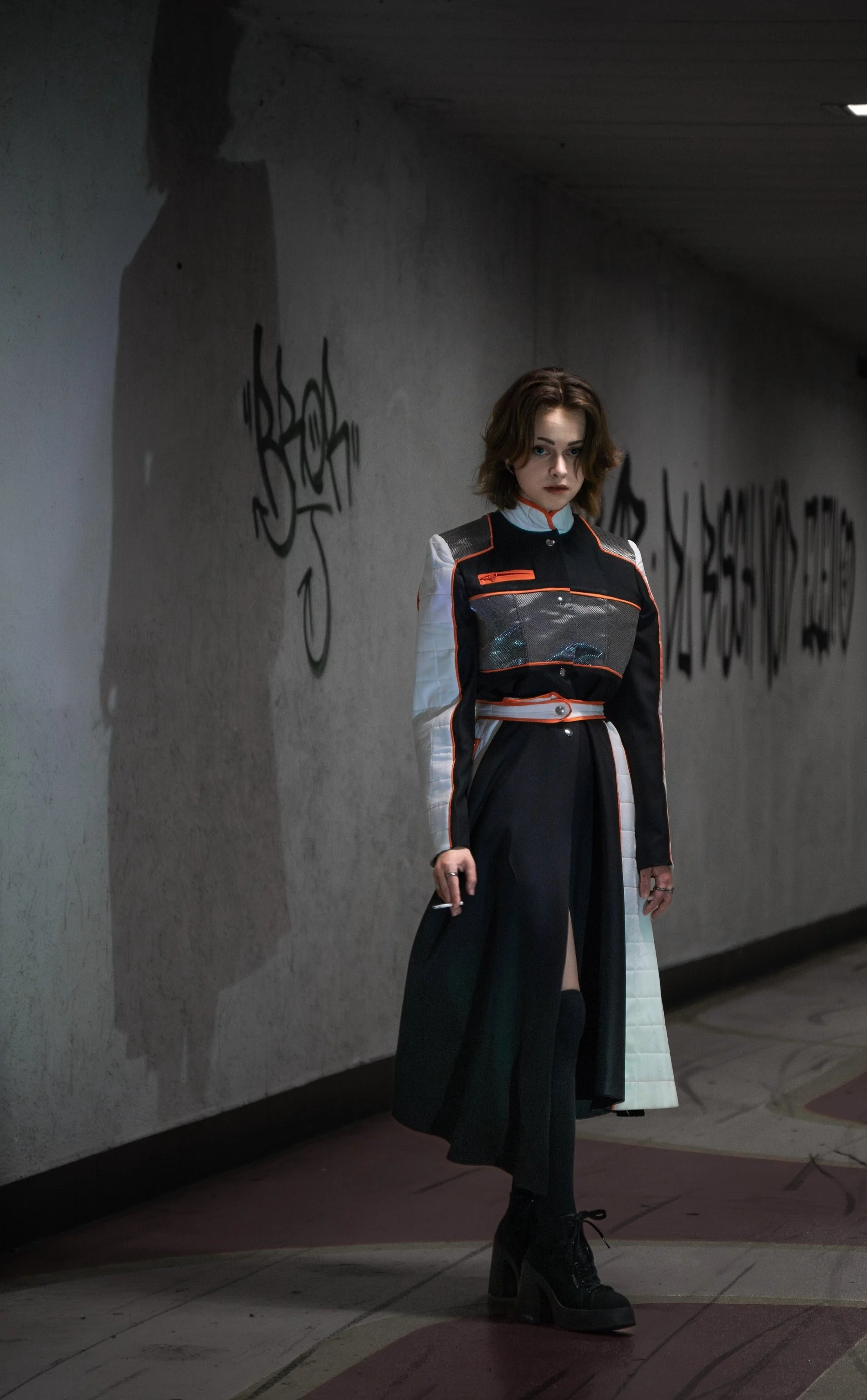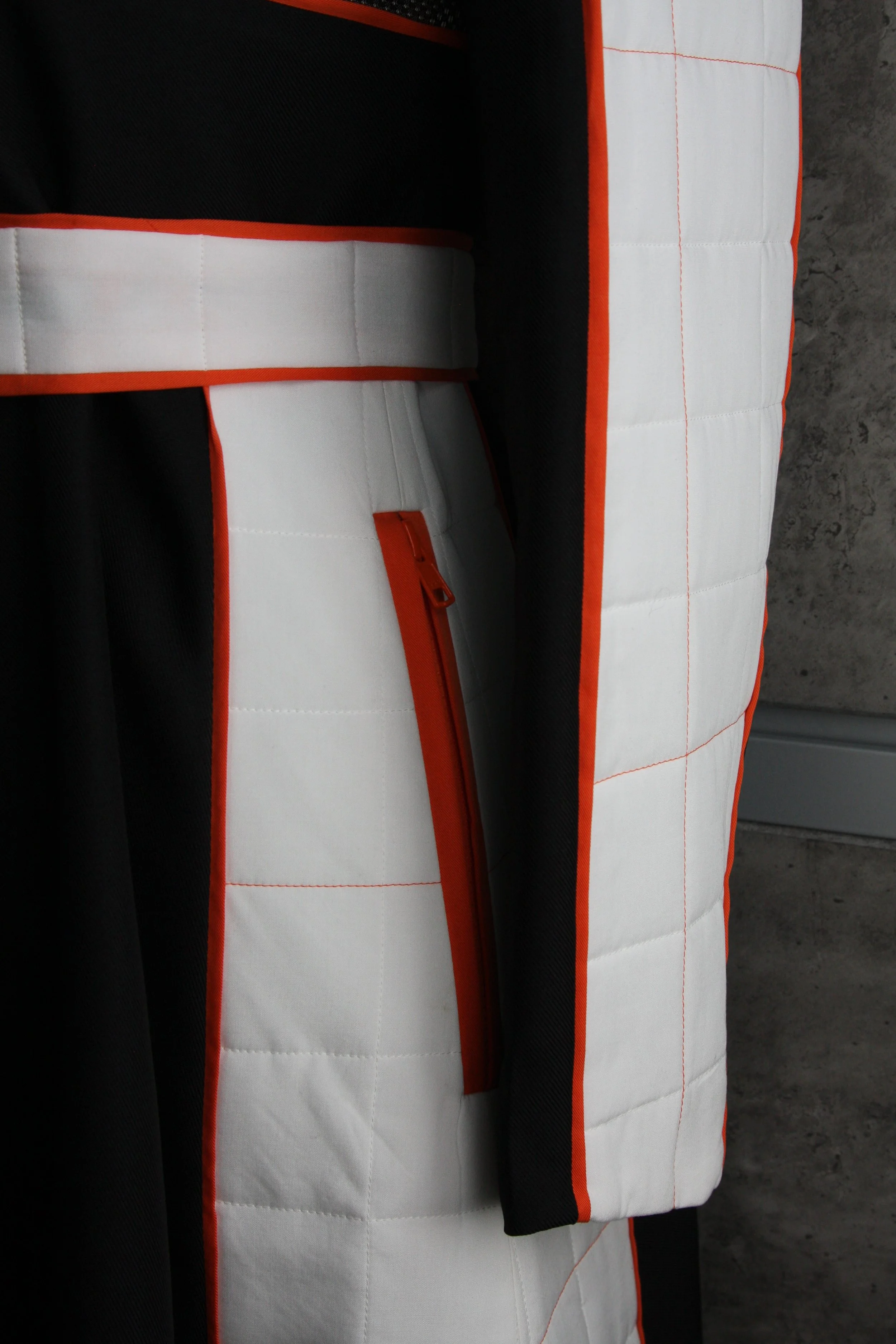 This coat symbolizes the distance, loneliness, and isolation often felt during tough times. Its large, enclosed design, accentuated by the hood, reinforces this sense of confinement. The asymmetrical skirt adds an unsettling touch, while the straight seams and topstitching create a graphic effect that suggests a fragile stability. The mesh wire insert shields the torso, the body's most vulnerable area, offering protection to the heart from further harm.
