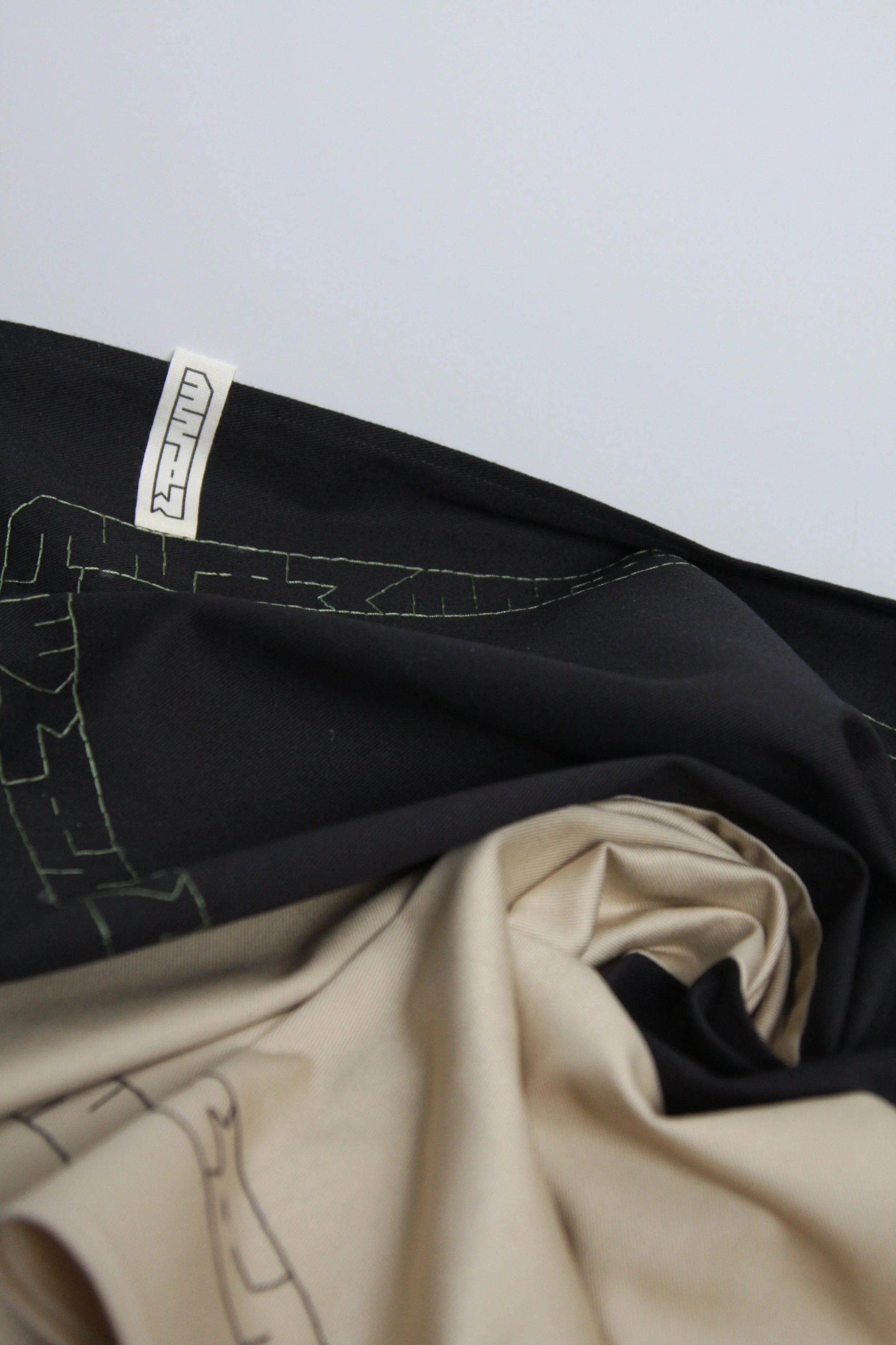 The typical BANDANA is typically a simple square of fabric, leaving little room for creative shaping. I wanted to change that by rethinking the concept and working with color arrangements instead of relying solely on the fabric's shape. The bandana is divided into two halves: one side is black, and the other is either green or beige. This design allows for endless possibilities when it comes to folding and rolling, offering a wide range of color combinations that let you tailor the bandana to match your personal style or the look you’re going for on any given day.