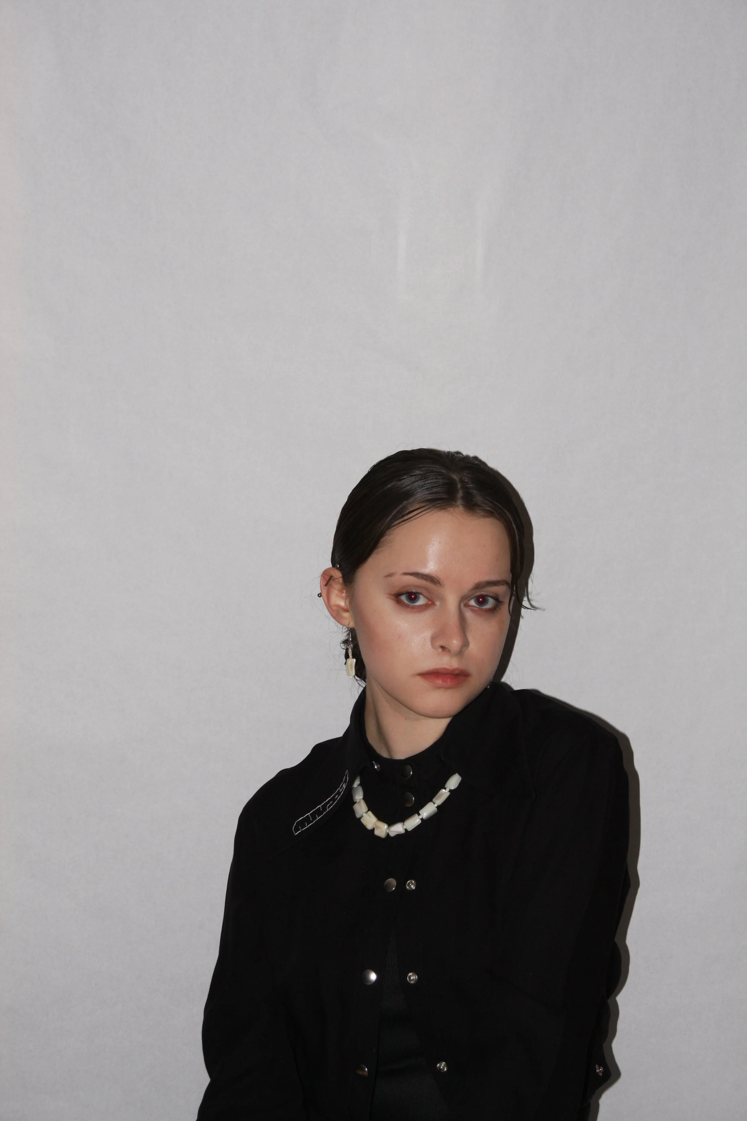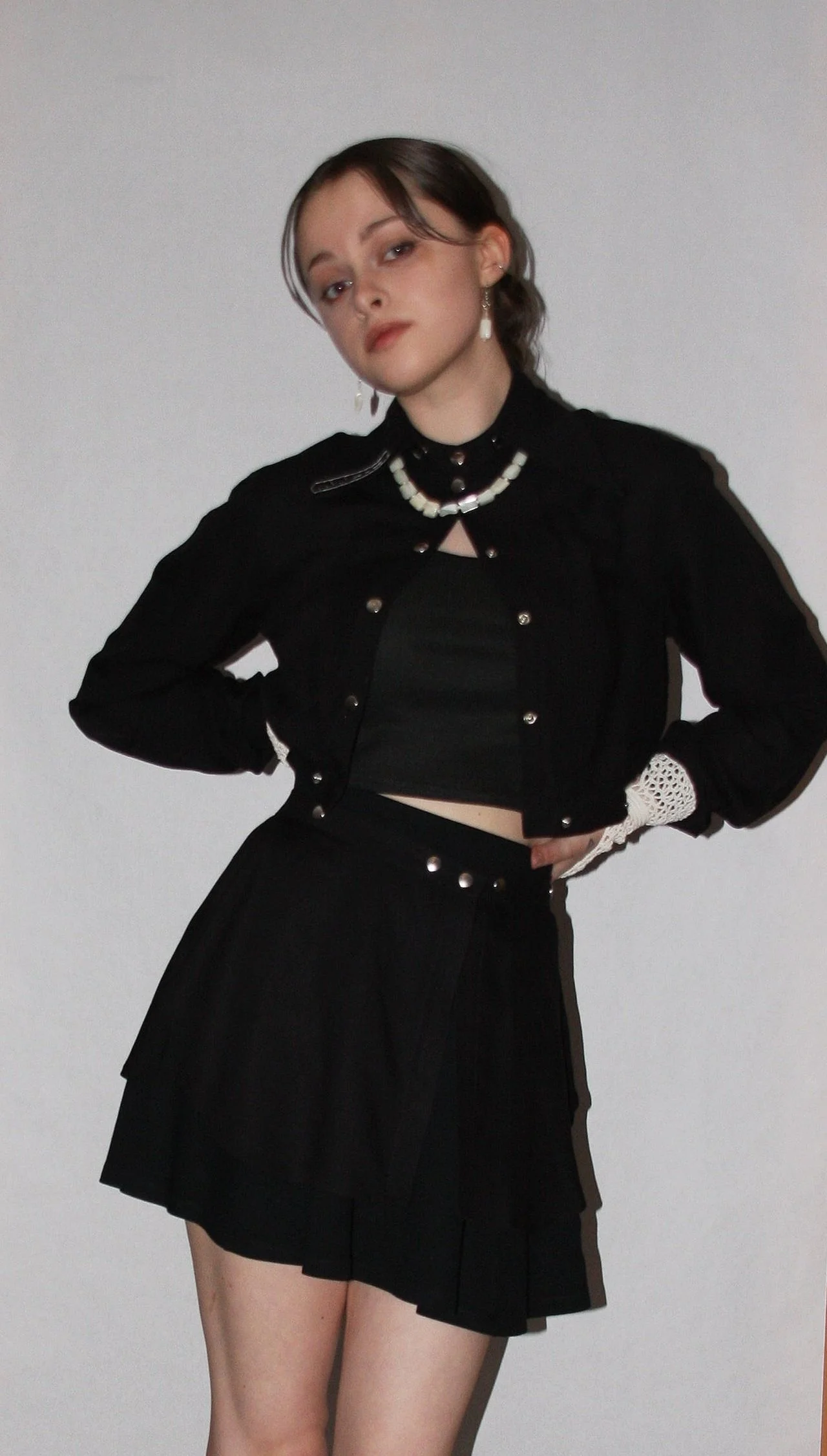 With multiple styling possibilities, the BLOUSE is a showpiece of versatility. It features a small stand-up collar with press-on buttons, allowing you to switch between three different collars: a higher stand-up collar, an embroidered shirt collar, and a hand-crocheted off-white collar that matches the gloves, sleeves, and crochet details on the bags.