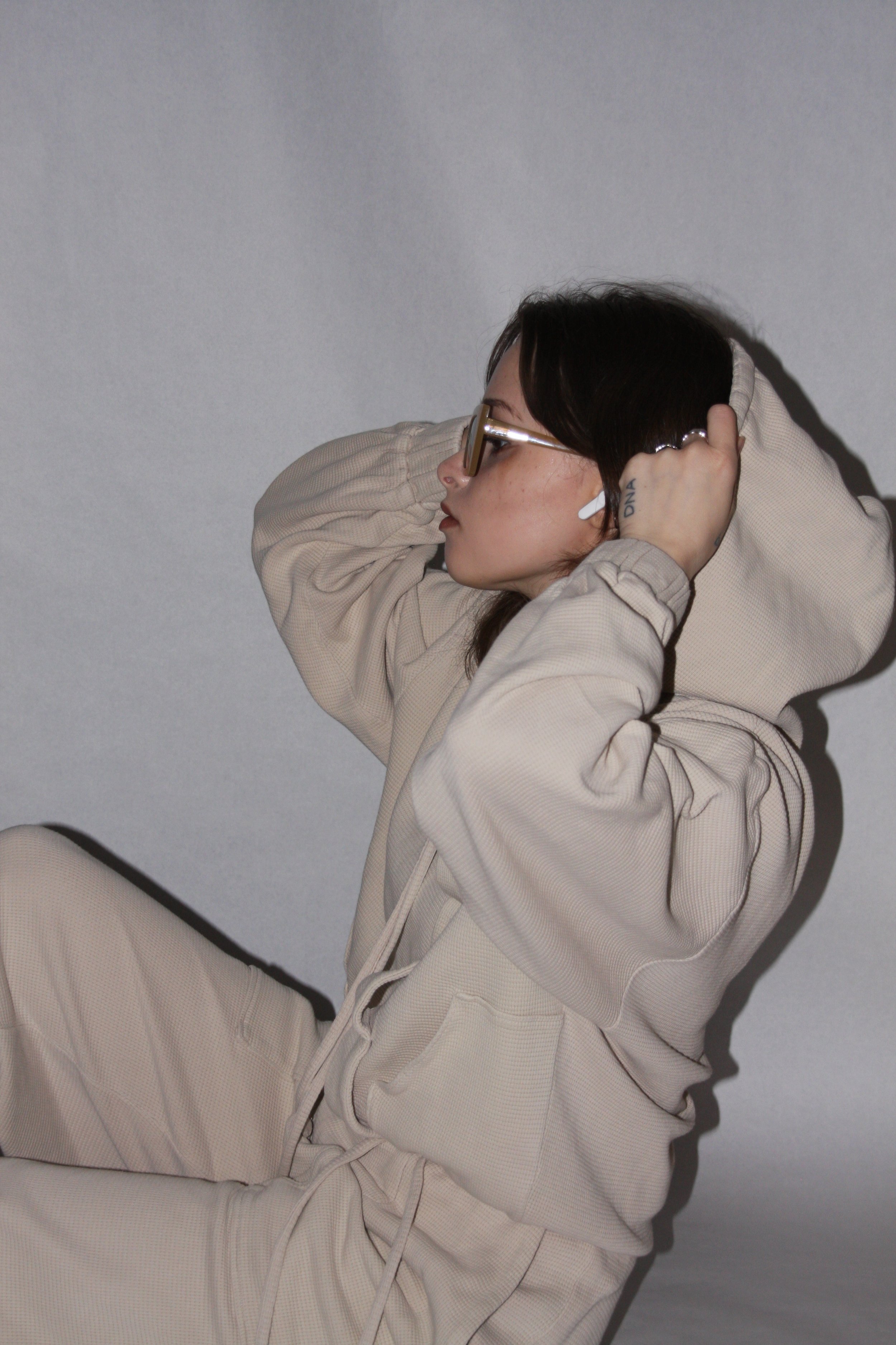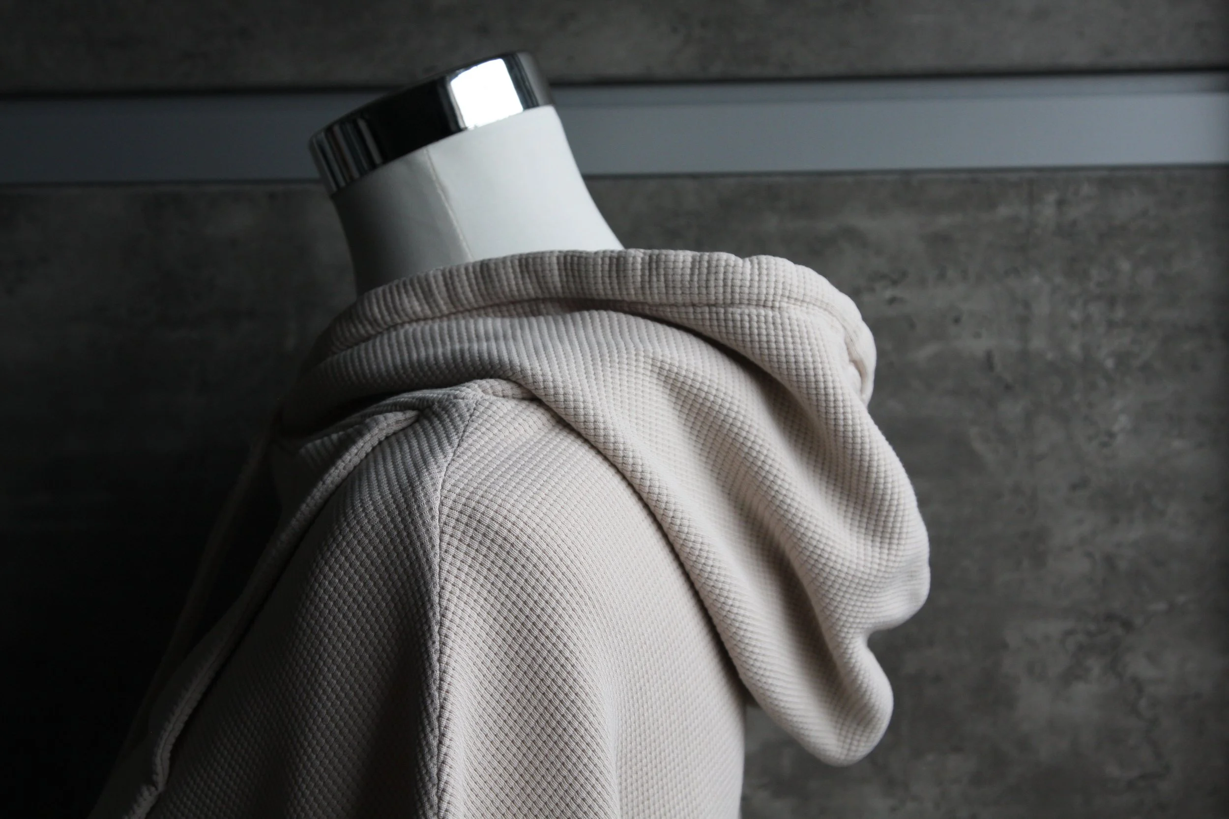 In line with other elements of the collection and especially the matching JOGGERS, the loops in the front left add another layer of texture to the waffle-jersey fabric. They don’t really have a practical purpose other than getting caught on door handles.