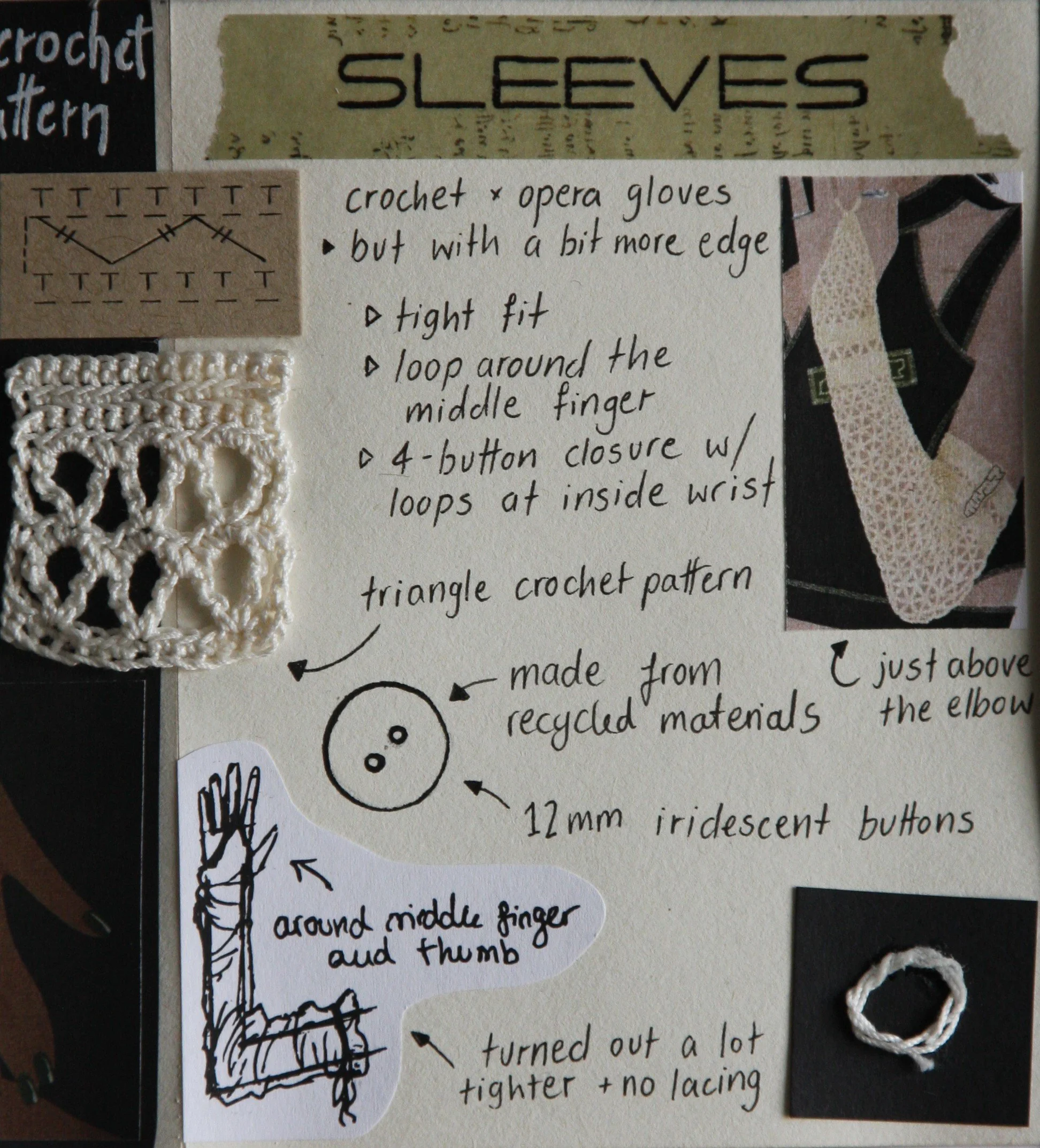 The design of these sleeves is unique and inspired by the elegance of classic opera gloves. They feature a delicate loop around the middle finger that extends all the way up to the elbow, adding a sense of refinement and grace. To ensure a secure and comfortable fit at the wrist, each sleeve is fastened with four small, iridescent cream-colored buttons on the inside. These buttons serve not only as functional elements but as subtle details that enhance the overall refined look of the sleeves.