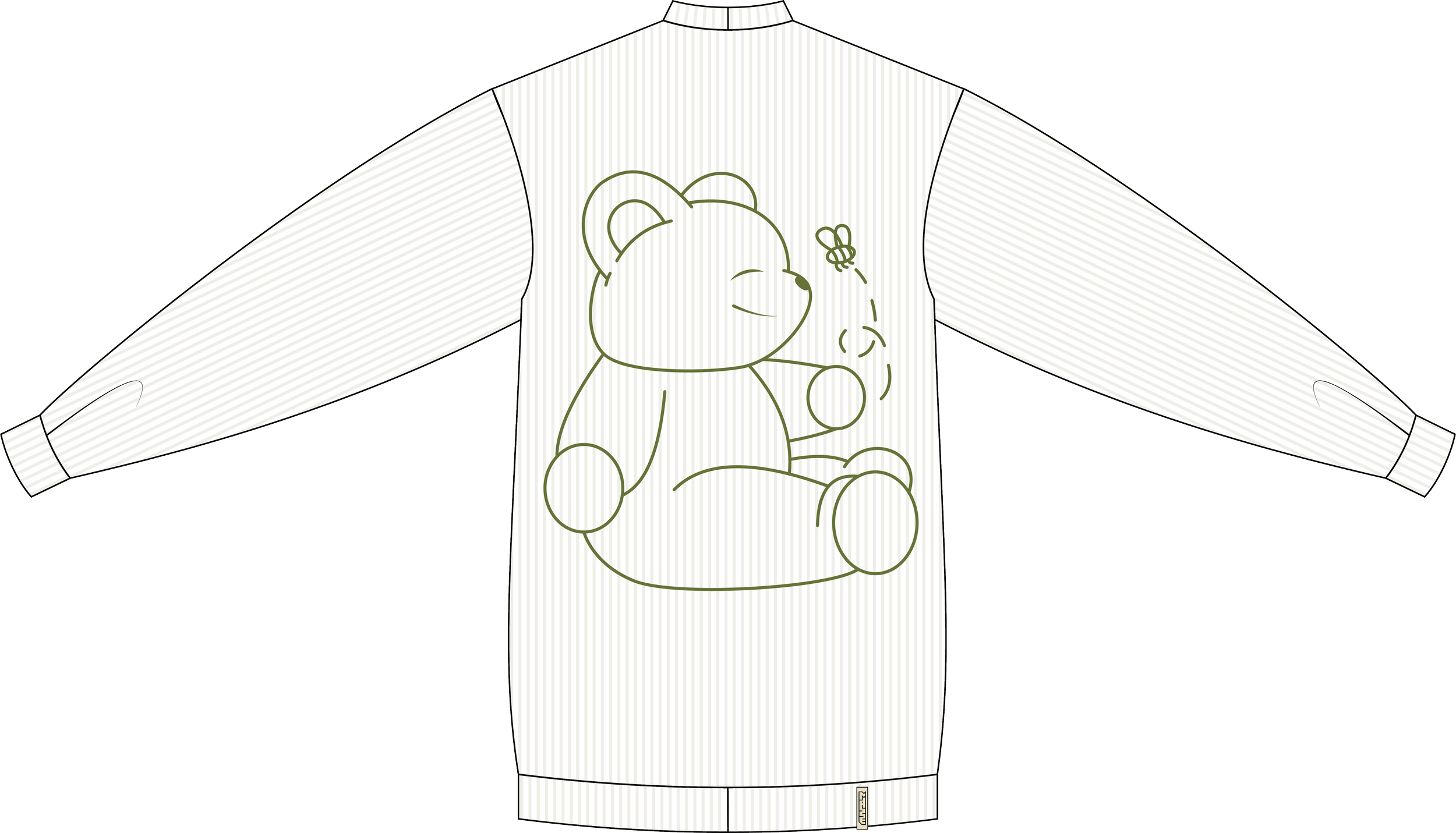 This garment features an oversized sweater silhouette that extends to the length of a dress. The waistline is subtly cinched with two small buttons placed on the front sides, accompanied by matching button loops at the side seam. However, the real focal point of this piece is the large, handmade teddy bear embroidery on the back, that took me over 50 hours to complete. The bear is playfully chasing a bee, a direct homage to Winnie the Pooh's endearing affection for honey, symbolizing both childhood nostalgia and a love of nature.