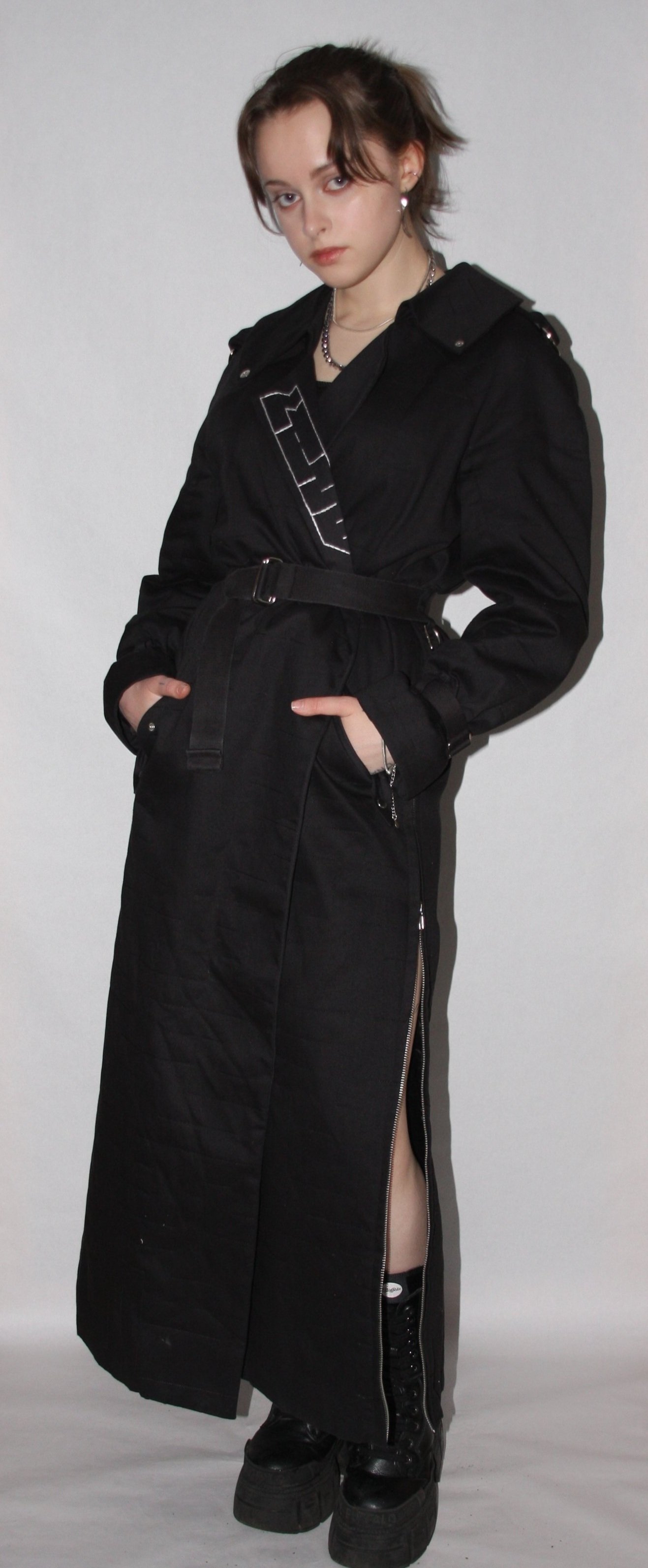 In addition to the signature trench coat collar and shoulder flaps, the coat also features welted pockets on the front and inside for added functionality. A few subtle pieces of hardware elevate the design, while the contrasting chainstitch embroidery on the front lapel adds a striking visual detail, making this coat as stylish as it is functional.