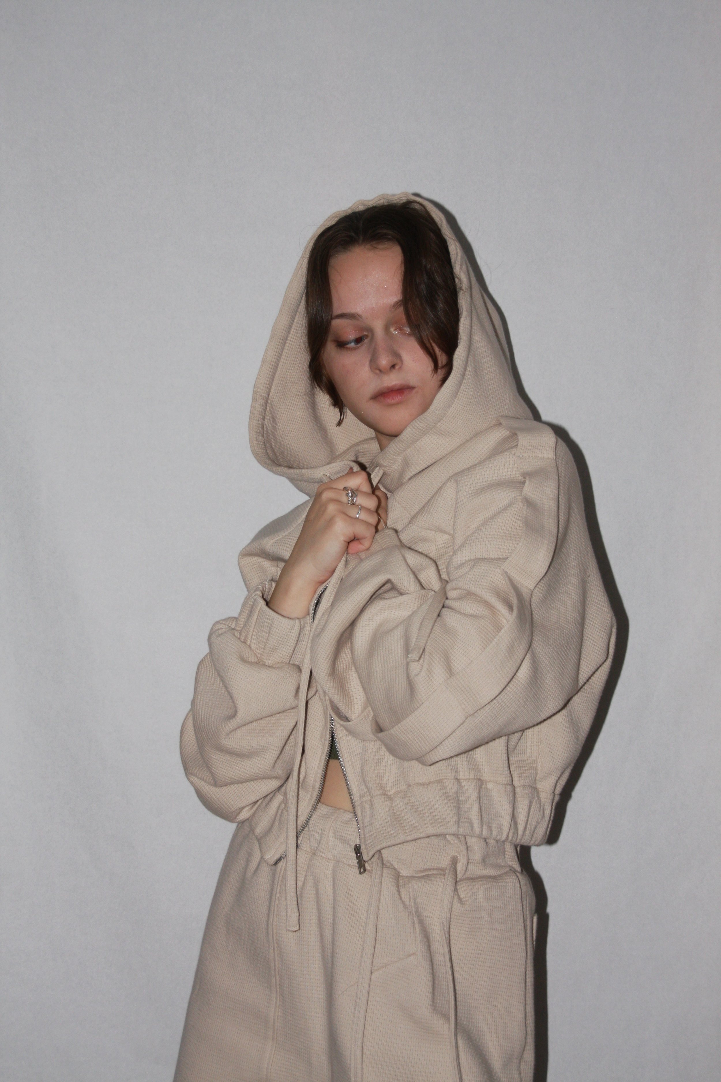 This ZIP-UP is a reimagined version of the HOODIE, crafted from the same materials and built on the original pattern with a few subtle yet impactful alterations. It features a large hood and relaxed sleeves that taper into structured, shape-defining cuffs, making it the ideal layering piece for when it gets chilly.